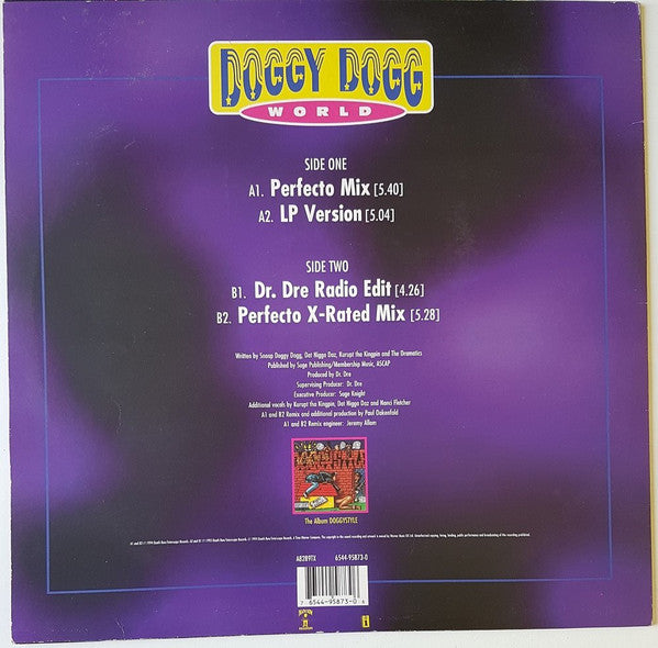 A1. Doggy Dogg World (Perfecto Mix) 5:40 A2. Doggy Dogg World (LP Version) 5:04 B1. Doggy Dogg World (Dr. Dre Radio Edit) 4:26 B2. Doggy Dogg World (Perfecto X-Rated Mix) 5:28