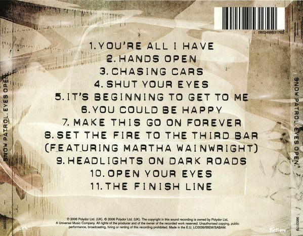 1. You're All I Have 4:332. Hands Open 3:173. Chasing Cars 4:284. Shut Your Eyes 3:175. It's Beginning To Get To Me 4:356. You Could Be Happy 3:047. Make This Go On Forever 5:478. Set The Fire To The Third Bar 3:239. Headlights On Dark Roads 3:3010. Open Your Eyes 5:4111. The Finish Line 3:28