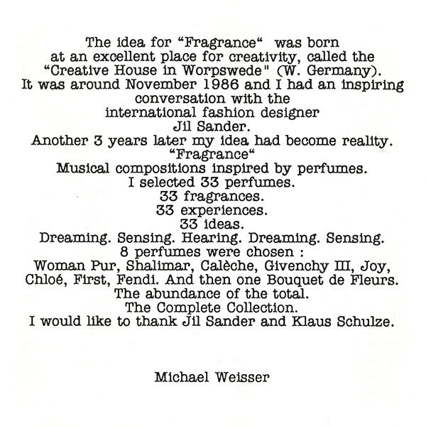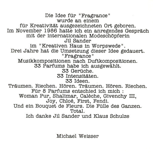 Liner notes contain a quote from "Handbuch der gesamten Parfümerie und Kosmetik" (Wien, 1932) [The Complete Handbook of Perfumery and Cosmetics (Vienna, 1932) by Fred Winter.