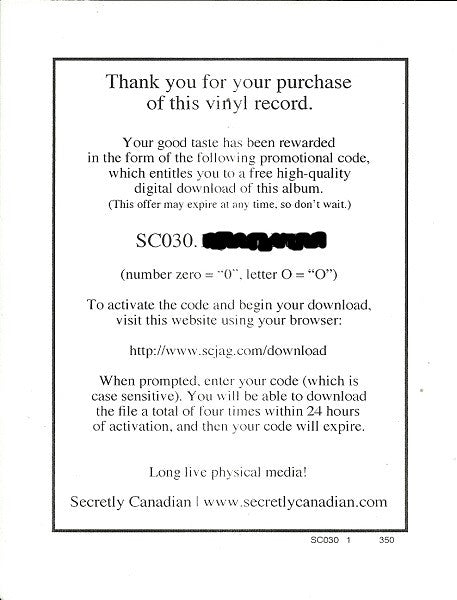 Includes MP3-Download-Code for the complete album and catalogue paper sheet presenting other releases by Secretly Canadian.