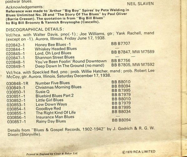 A1. Honey Bee Blues 3:00 A2. Whiskey Headed Blues 2:57 A3. Lord, Oh Lord Blues 3:01 A4. Shannon Street Blues 3:22 A5. You've Been Foolin' Round Downtown 2:44 A6. Deep Down In The Ground 3:14 A7. Number Five Blues 3:31 A8. Christmas Morning Blues 3:23 B1. Susie Q 3:11 B2. Bluebird Blues Part 2 3:23 B3. Little Girl Blues 3:18 B4. Low Down Ways 3:11 B5. Goodbye Red 3:06 B6. The Right Kind Of Life 3:21 B7. Insurance Man Blues 3:17 B8. Rainy Day Blues 2:49