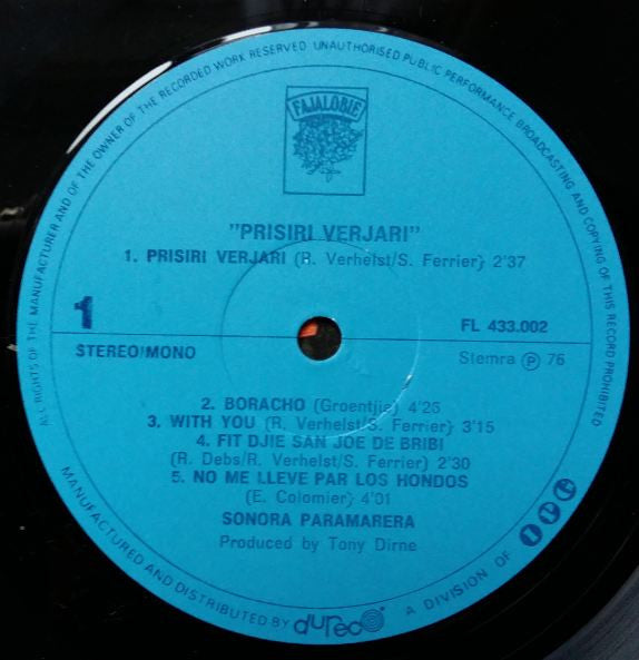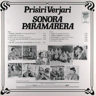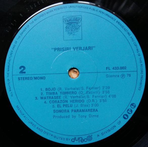 A1. Prisiri Verjari 2:37 A2. Boracho 4:26 A3. With You 3:15 A4. Fit Djie San Joe De Bribi 2:30 A5. No Me Llever Par Los Hondos 4:01 B1. Bojo 2:39 B2. Timba Timbero 3:55 B3. Watrasee 4:08 B4. Corazon Herido 3:55 B5. El Pelu 3:00