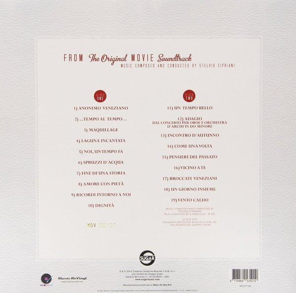 A1. Anonimo Veneziano 1:56 A2. ...Tempo Al Tempo... 1:12 A3. Maquillage 1:13 A4. Laguna Incantata 2:41 A5. Noi, Un Tempo Fa 1:17 A6. Spruzzi D'Acqua 1:28 A7. Fine Di Una Storia 1:34 A8. Amore Con Pietà 2:08 A9. Ricordi Intorno A Noi 2:20 A10. Dignità 2:20 B11. Un Tempo Bello 1:39 B12. Adagio - Dal Concerto Per Oboe E Orchestra D'Archi In Do Minore 4:59 B13. Incontro D'Autunno 1:14 B14. Come Una Volta 2:38 B15. Pensieri Del Passato 1:19 B16. Vicino A Te 1:06 B17. Broccati Veneziani 2:48 B18. Un Giorno Insieme 1:02 B19. Vento Caldo 1:42