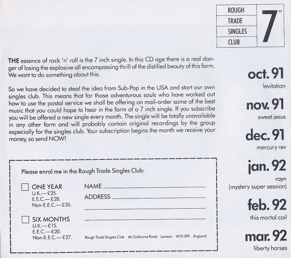 Issued with an insert, one side of which is a band photo. The other side is an advert for the Singles Club