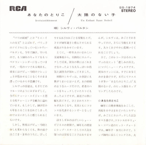 Both songs sung in French. Two-page insert folds out to a mini-poster of Sylvie. A-side title appears as Irrésistiblement on sleeve and as IRRESISTIBLEMENT on label.
