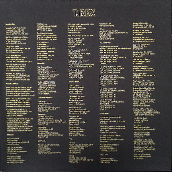 A1. Mambo Sun 3:39 A2. Cosmic Dancer 4:28 A3. Jeepster 4:11 A4. Monolith 3:45 A5. Lean Woman Blues 2:59 B1. Get It On 4:24 B2. Planet Queen 3:11 B3. Girl 2:29 B4. The Motivator 3:57 B5. Life's A Gas 2:25 B6. Rip Off 3:42 C1. Mambo Sun (Instrumental Edit) 3:49 C2. Cosmic Dancer (Single Vocal Mix) 4:26 C3. Jeepster (Single Vocal Mix) 4:18 C4. Monolith (Working Version) 2:23 C5. Lean Woman Blues (Working Version) 3:05 D1. Get It On (Full Length Version) 5:48 D2. Planet Queen (Working Version) 2:56 D3. Girl (Alternate Master) 2:36 D4. The Motivator (Working Version) 3:57 D5. Life's A Gas (Working Version) 3:32 D6. Rip Off (Instrumental) 3:18