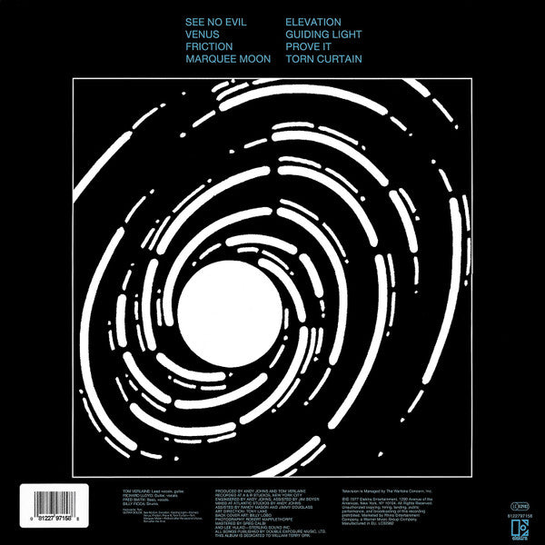 Marketed by Rhino Entertainment Company, a Warner Music Group Company. Manufactured in the E.U. EU reissue from 2012, marketed by Rhino Entertainment Company. Shrinkwrapped, pressed at Optimal, plated at RTI and mastered by Chris Bellman. Original Rhino [r4111082 is in a plastic outer bag, newer versions in shrink. US versions have R1 1098 on the cover, label, inner sleeve and sticker where EU version has 8122797158. Vinyl comes in a printed black & white inner sleeve including lyrics and a picture. This vinyl pressing includes the full length version of "Marquee Moon" without fading at the end. Its printed duration is 9:58 instead 10:38 in reality. Printed credits cite Sterling Sound which is only valid for original LP version.