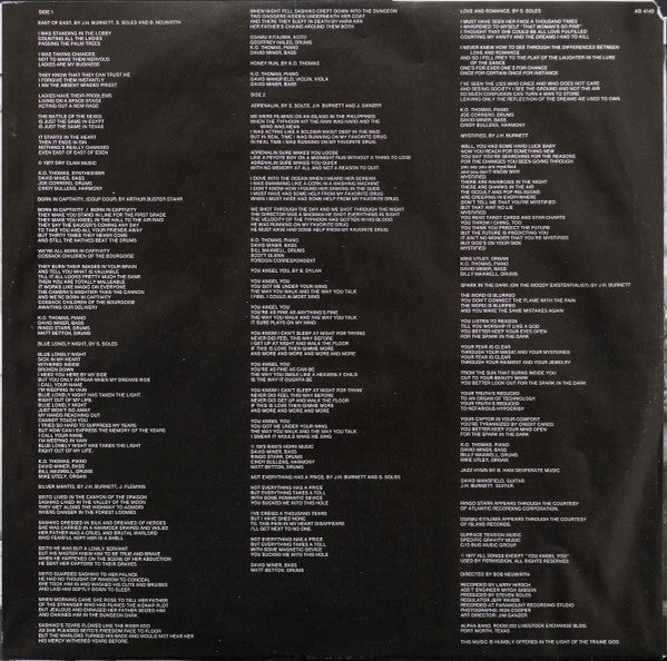 A1. East Of East 3:10 A2. Born In Captivity 3:44 A3. Blue Lonely Night 3:26 A4. Silver Mantis 6:35 A5. Honey Runs 3:11 B1. Adrenalin 2:51 B2. You Angel You 2:44 B3. Not Everything Has A Price 2:40 B4. Love And Romance 2:50 B5. Mystified 2:36 B6. Spark In The Dark (On The Moody Existentialist) 4:18 B7. Jazz Hymn 1:52