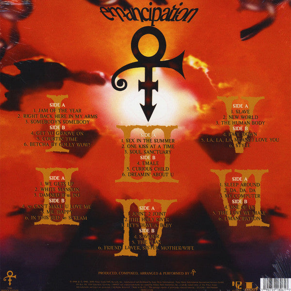 A1. Jam Of The Year A2. Right Back Here In My Arms A3. Somebody's Somebody B1. Get Yo Groove On B2. Courtin' Time B3. Betcha By Golly Wow! . Emancipation II C1. We Gets Up C2. White Mansion C3. Damned If I Do D1. I Can't Make U Love Me D2. Mr. Happy D3. In This Bed I Scream . Emancipation III E1. Sex In The Summer E2. One Kiss At A Time E3. Soul Sanctuary F1. Emale F2. Curious Child F3. Dreamin' About U . Emancipation IV G1. Joint 2 Joint G2. The Holy River G3. Let's Have A Baby H1. Saviour H2. The Plan H3. Friend, Lover, Sister, Mother / Wife . Emancipation V I1. Slave I2. New World I3. The Human Body J1. Face Down J2. La, La, La Means I Love You J3. Style . Emancipation VI K1. Sleep Around K2. Da, Da, Da K3. My Computer L1. One Of Us L2. The Love We Make L3. Emancipation
