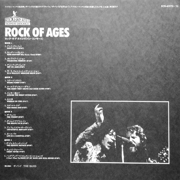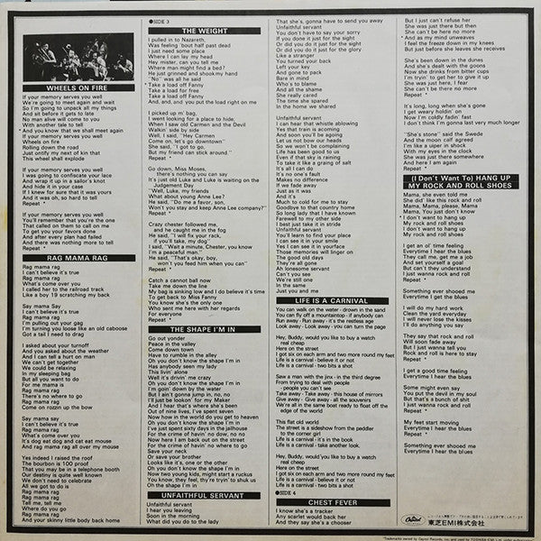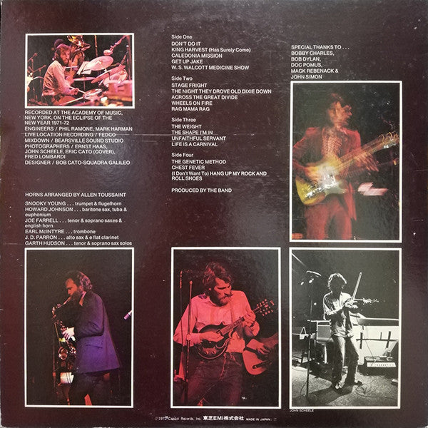 A1. Don't Do It 6:00 A2. King Harvest (Has Surely Come) 3:38 A3. Caledonia Mission 3:12 A4. Get Up Jake 3:09 A5. W.S. Walcott Medicine Show 3:57 B1. Stage Fright 4:26 B2. The Night They Drove Old Dixie Down 4:36 B3. Across The Great Divide 3:24 B4. Wheels On Fire 3:41 B5. Rag Mama Rag 4:03 C1. The Weight 5:33 C2. The Shape I'm In 3:48 C3. Unfaithful Servant 4:20 C4. Life Is A Carnival 4:08 D1. The Genetic Method 8:05 D2. Chest Fever 4:43 D3. (I Don't Want To) Hang Up My Rock And Roll Shoes 5:08
