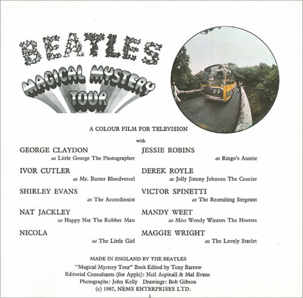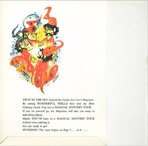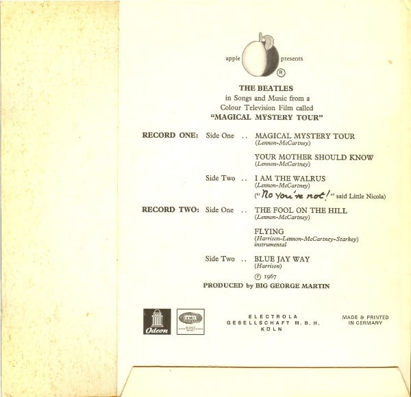 The Beatles In Songs and Music from the T.V. Film "Magical Mystery Tour" Gatefold cover Made & Printed in Germany. With inside a 24 page booklet with photos and "The Story Of Magical Mystical Tour" + a 4 page song-lyrics sheet. ℗ 1967 © 1967, NEMS Enterprises Ltd. © All lyrics copyright 1967 for the world by Northern Songs Ltd. England