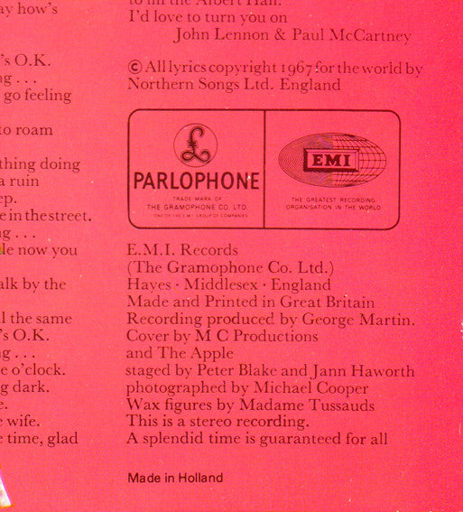 Apple labels. Stereo symbol with ST 33 in two overlapping ellipses. On vinyl: Ring text in german and english. Side info in german (Seite 1, Seite 2). Made in EEC. On backcover (in the text): Made and Printed in Great Britain. On backcover (bottom right): Made in Holland