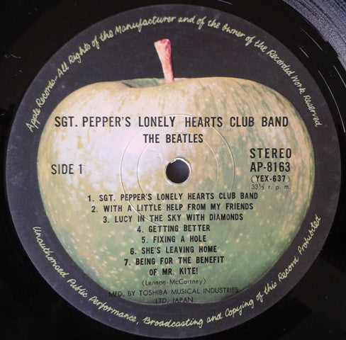 A1. Sgt. Pepper's Lonely Hearts Club Band 1:59 A2. With A Little Help From My Friends 2:46 A3. Lucy In The Sky With Diamonds 3:25 A4. Getting Better 2:47 A5. Fixing A Hole 2:33 A6. She's Leaving Home 3:24 A7. Being For The Benefit Of Mr. Kite 2:36 B1. Within You, Without You 5:03 B2. When I'm Sixty-Four 2:38 B3. Lovely Rita 2:43 B4. Good Morning, Good Morning 2:35 B5. Sgt. Pepper's Lonely Hearts Club Band (Reprise) 1:20 B6. A Day In The Life 5:03