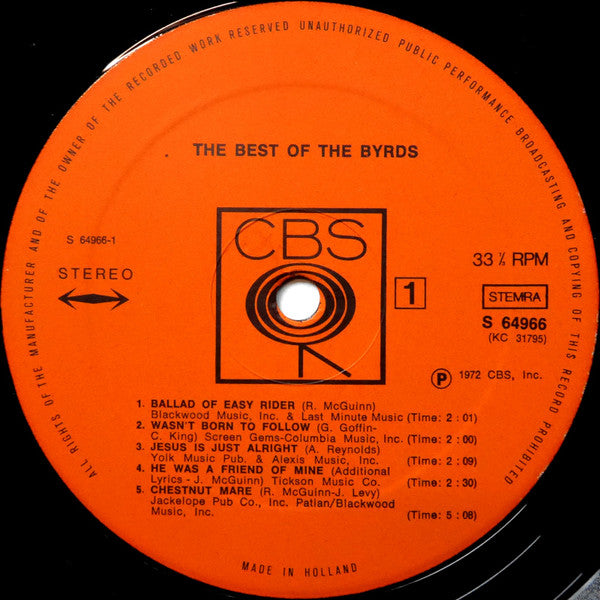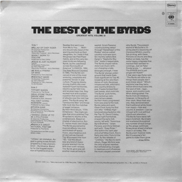 A1. Ballad Of Easy Rider 2:01 A2. Wasn't Born To Follow 2:00 A3. Jesus Is Just Alright 2:09 A4. He Was A Friend Of Mine 2:30 A5. Chestnut Mare 5:08 B1. Tiffany Queen 2:40 B2. Drug Store Truck Drivin' Man 3:52 B3. You Ain't Going Nowhere 2:34 B4. Citizen Kane 2:34 B5. I Wanna Grow Up To Be A Politician 2:02 B6. America's Great National Pastime 2:58