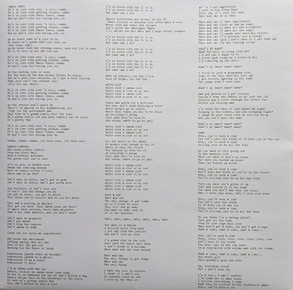 A1. Janie Jones 2:07 A2. Remote Control 3:03 A3. I'm So Bored With The U.S.A. 2:24 A4. White Riot 1:56 A5. Hate & War 2:06 A6. What's My Name 1:41 A7. Deny 3:06 A8. London's Burning 2:11 B1. Career Opportunities 1:54 B2. Cheat 2:06 B3. Protex Blue 1:47 B4. Police & Thieves 6:03 B5. 48 Hours 1:36 B6. Garageland 3:11