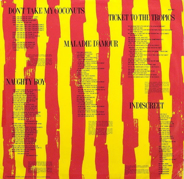A1. Don't Take My Coconuts 2:20 A2. Naughty Boy 3:51 A3. Maladie D'Amour 3:12 A4. Ticket To The Tropics 3:50 A5. Indiscreet 2:41 B1. Kriminal-Tango 4:40 B2. Did You Have To Love Me Like You Did 5:42 B3. If I Only Had A Brain 2:44 B4. The Glory That Was Eden 4:17