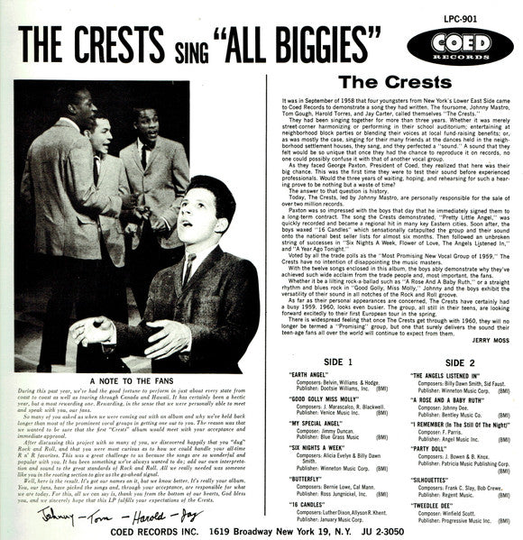Includes "A Note To The Fans" from The Crests & cover notes by Jerry Moss.