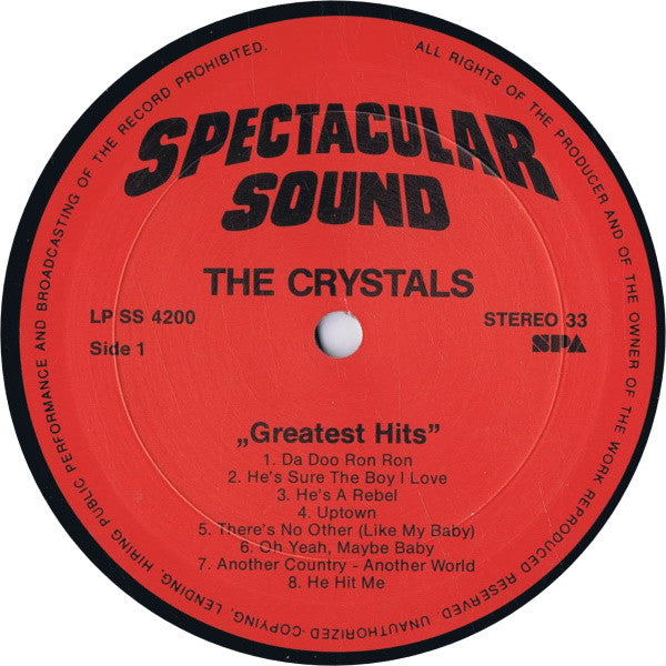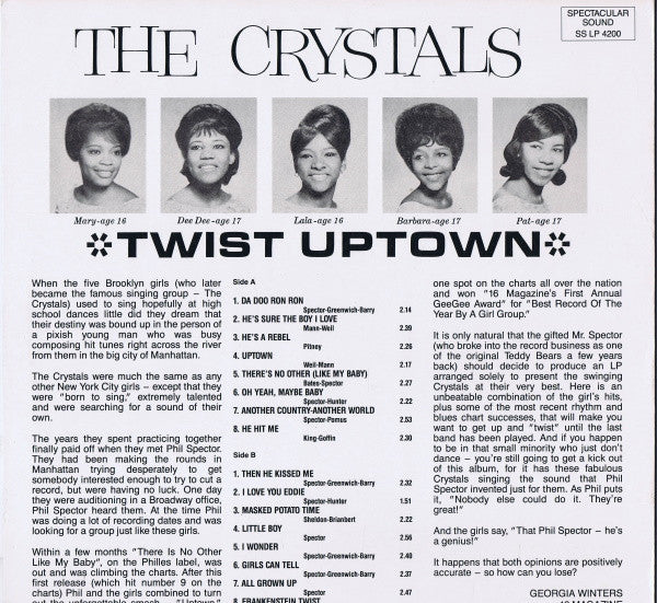 A1. Da Doo Ron Ron 2:14 A2. He's Sure The Boy I Love 2:39 A3. He's A Rebel 2:26 A4. Uptown 2:17 A5. There's No Other (Like My Baby) 2:27 A6. Oh Yeah, Maybe Baby 2:22 A7. Another Country - Another World 2:53 A8. He Hit Me 2:30 B1. Then He Kissed Me 2:32 B2. I Love You Eddie 1:51 B3. Mashed Potato Time 2:22 B4. Little Boy 2:56 B5. I Wonder 2:40 B6. Girls Can Tell 2:37 B7. All Grown Up 2:47 B8. Frankenstein Twist 2:53