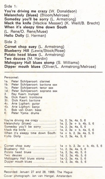 A1. You're Driving Me Crazy A2. Melancholy (Blues) A3. Someday You'll Be Sorry A4. Mack The Knife A5. When It's Sleepy Time Down South A6. Hello Dolly B1. Cornet Chop Suey B2. Blueberry Hill B3. Potato Head Blues B4. Two Deuces B5. Mahogany Hall Blues Stomp B6. Dipper Mouth Blues