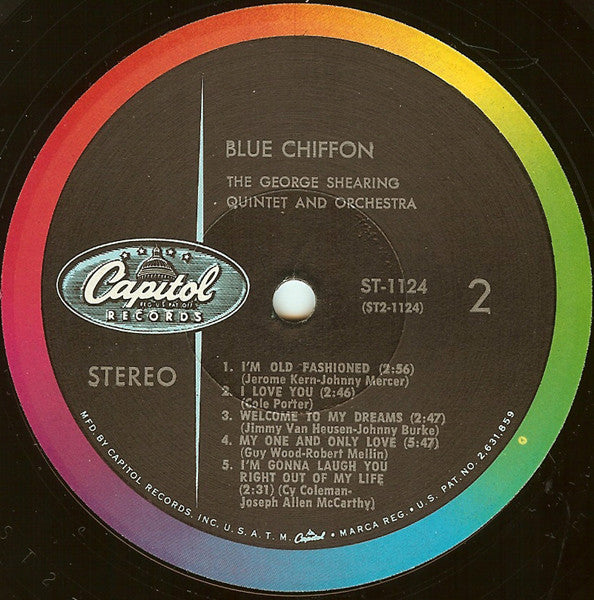 LCCN Label A / B: ST-1124 Back cover / spine: ST1124 BaOI [l313252, pressing denoted by the anvil/lathe stamp (⌂) located in the runouts. The trailing ampersand (&) confirms that the lacquers were stereo. Stereo Messaging Front cover: Capitol stereo the full spectrum of sound (text) Capitol Records high fidelity recording (mark) Back cover: Capitol stereo the full spectrum of sound (text) Capitol Records high fidelity recording (mark) George Shearing, his piano and quintet, with a full string choir, create moods of blue chiffon in rich music highlighted by the spaciousness of stereo sound. (text) This stereo record should be played only with a stereo cartridge and needle to avoid damage. (text) Label A / B: stereo (text) Spine: stereophonic (text) Other Messaging Back cover: Factories: Scranton, Pa.—Los Angeles, Calif. (text)
