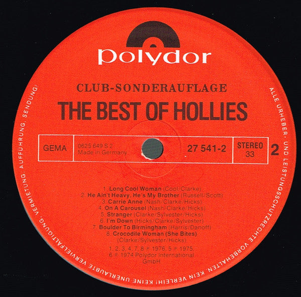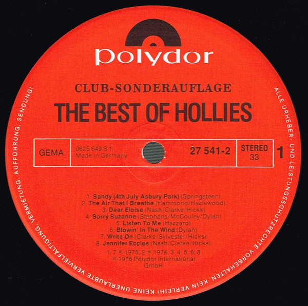 A1. Sandy (4th July Asbury Park) A2. The Air That I Breathe A3. Dear Eloise A4. Sorry Suzanne A5. Listen To Me A6. Blowin' In The Wind A7. Write On A8. Jennifer Eccles B1. Long Cool Woman B2. He Ain't Heavy, He's My Brother B3. Carrie Anne B4. On A Carousel B5. Stranger B6. I'm Down B7. Boulder To Birmingham B8. Crocodile Woman (She Bites)