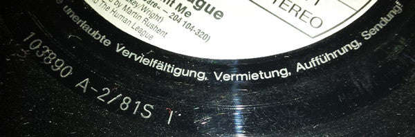 This variant is the GEMA STEMRA version without printed STEREO and cat# on the upper right corner of the front sleeve. There is another variant containing this detail. Taken From The Album »Dare« - 204 104-320 ℗ 1981 Virgin Records Ltd. Dinsong/Virgin Music Publ. Ltd./Sound Diagrams/April Ariola-Eurodisc GmbH., München Thank you Gangsters Restaurant, Sheffield