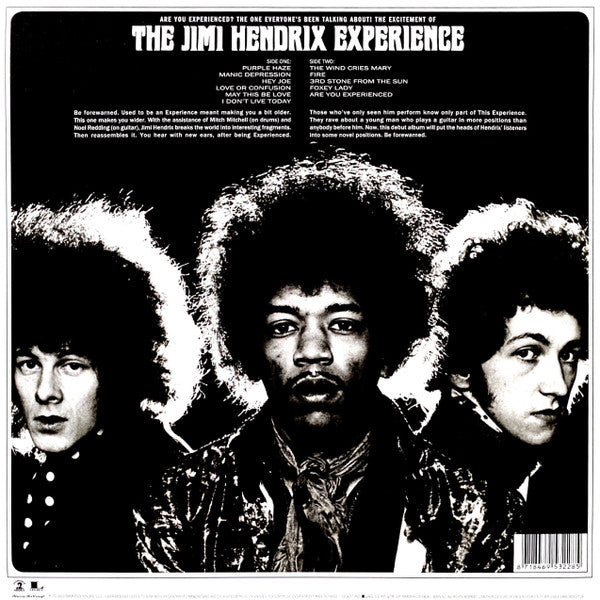 A1. Purple Haze 2:50 A2. Manic Depression 3:42 A3. Hey Joe 3:30 A4. Love Or Confusion 3:12 A5. May This Be Love 3:10 A6. I Don't Live Today 3:54 B1. The Wind Cries Mary 3:20 B2. Fire 2:43 B3. 3rd Stone From The Sun 6:44 B4. Foxey Lady 3:18 B5. Are You Experienced? 4:14
