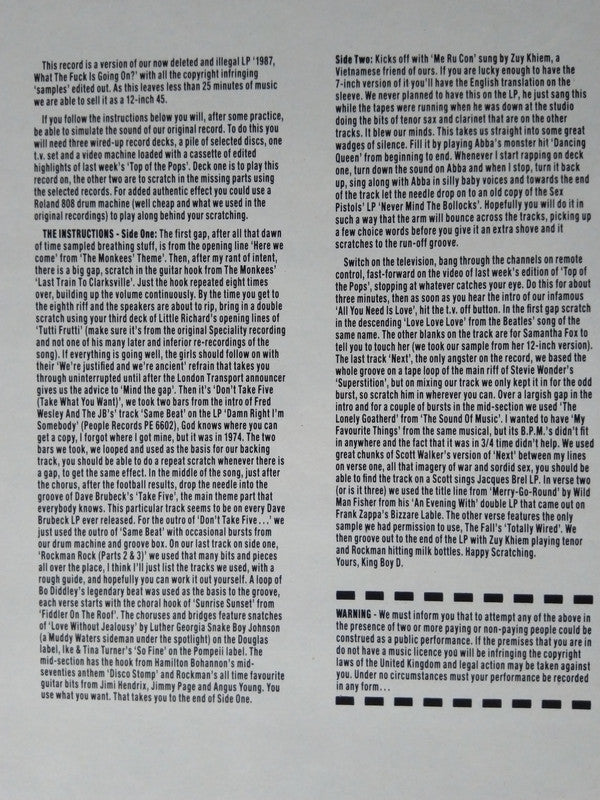 Edited (free of dangerously illegal samples) version of the LP [r=140785. Includes free instructions on how to add your own samples and recreate the original release in the privacy and comfort of your own home or studio. Issued in a picture sleeve.