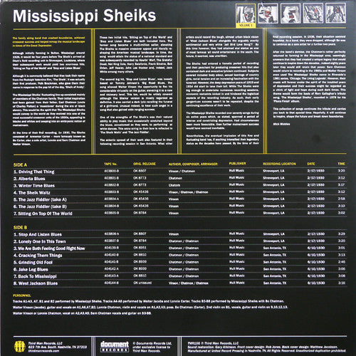 A1. Mississippi Sheiks - Driving That Thing 3:20 A2. Mississippi Sheiks - Alberta Blues 3:12 A3. Mississippi Sheiks - Winter Time Blues 3:17 A4. Walter Jacobs (2), Lonnie Carter - The Sheik Waltz 3:12 A5. Walter Jacobs (2), Lonnie Carter - The Jazz Fiddler (Take A) 2:58 A6. Walter Jacobs (2), Lonnie Carter - The Jazz Fiddler (Take B) 3:10 A7. Mississippi Sheiks - Sitting On Top Of The World 3:02 B1. Mississippi Sheiks - Stop And Listen Blues 3:29 B2. Mississippi Sheiks - Lonely One In This Town 3:20 B3. Mississippi Sheiks, Bo Chatman - We Are Both Feeling Good Right Now 3:01 B4. Mississippi Sheiks, Bo Chatman - Cracking Them Things 3:13 B5. Mississippi Sheiks, Bo Chatman - Grinding Old Fool 2:46 B6. Mississippi Sheiks, Bo Chatman - Jake Leg Blues 3:06 B7. Mississippi Sheiks, Bo Chatman - Back To Mississippi 3:08 B8. Mississippi Sheiks, Bo Chatman - West Jackson Blues 3:16