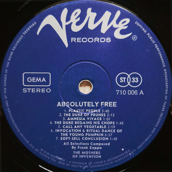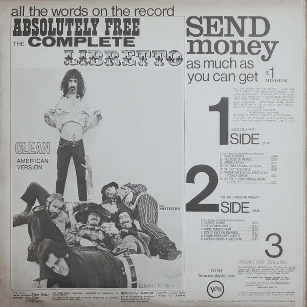 A1. Plastic People 3:40 A2a. The Duke Of Prunes 2:12 A2b. Amnesia Vivace 1:01 A2c. The Duke Regains His Chops 1:45 A3a. Call Any Vegetable 2:19 A3b. Invocation And Ritual Dance Of The Young Pumpkin 6:57 A3c. Soft-Sell Conclusion & Ending Of Side #1 1:40 B1. America Drinks 1:52 B2. Status Back Baby 2:52 B3. Uncle Bernie's Farm 2:09 B4. Son Of Suzy Creamcheese 1:33 B5. Brown Shoes Don't Make It 7:26 B6. America Drinks & Goes Home 2:43