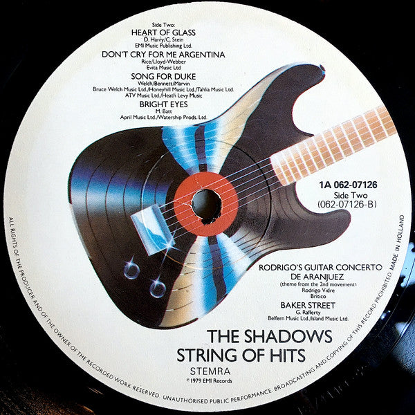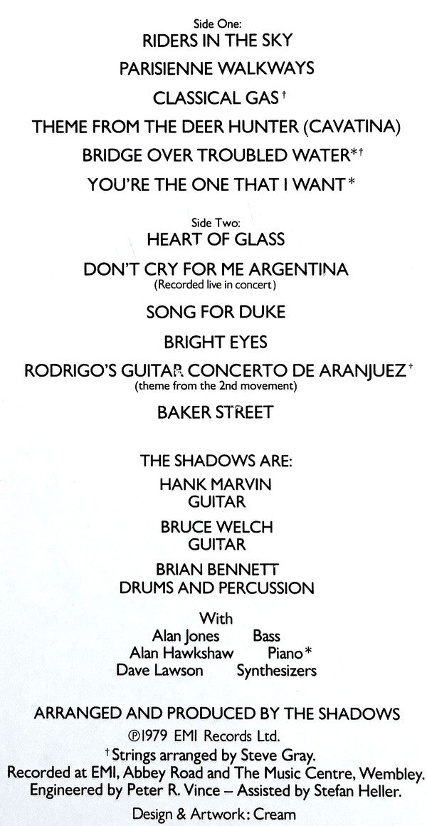 A1. Riders In The Sky 3:46 A2. Parisienne Walkways 3:23 A3. Classical Gas 3:05 A4. Theme From The Deer Hunter (Cavatina) 3:24 A5. Bridge Over Troubled Water 4:37 A6. You're The One That I Want 3:00 B1. Heart Of Glass 3:31 B2. Don't Cry For Me Argentina (Recorded Live In Concert) 3:29 B3. Song For Duke 3:57 B4. Bright Eyes 3:47 B5. Rodrigo's Guitar Concerto De Aranjuez (Theme From The 2nd Movement) 3:25 B6. Baker Street 4:53