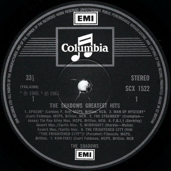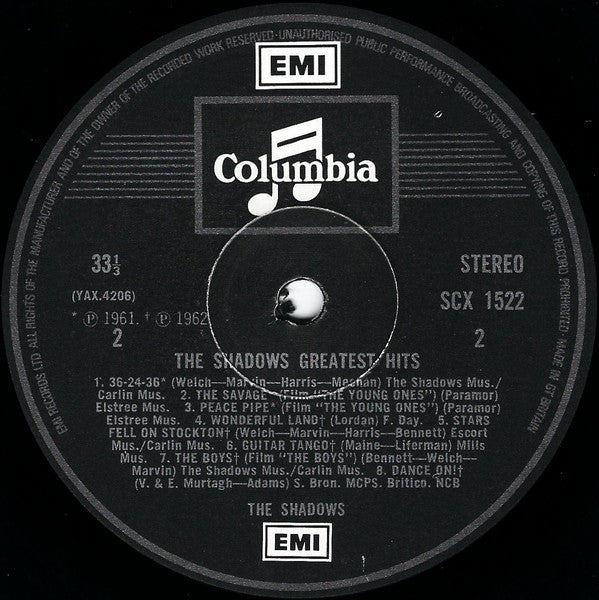 A1. Apache A2. Man Of Mystery A3. The Stranger A4. F.B.I. A5. Midnight A6. The Frightened City A7. Kon-Tiki B1. 36-24-36 B2. The Savage B3. Peace Pipe B4. Wonderful Land B5. Stars Fell On Stockton B6. Guitar Tango B7. The Boys B8. Dance On!