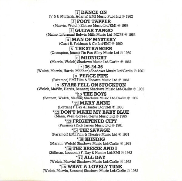1. Dance On 2:222. Foot Tapper 2:333. Guitar Tango 2:594. Man Of Mystery 2:005. The Stranger 2:386. Midnight 2:297. 36-24-36 1:398. Peace Pipe 2:119. Stars Fell On Stockton 2:1510. The Boys 2:3011. Mary Anne 2:2512. Don't Make My Baby Blue 2:1313. Frightened City 2:2014. The Savage 2:2215. Shindig 2:1716. The Breeze And I 2:4817. All Day 2:3318. What A Lovely Tune 2:1719. Bo Diddley 2:0620. Quartermaster Stores 2:2221. The Bandit 2:4022. Little B 5:0223. South Of The Border 3:1824. Shazam 2:19