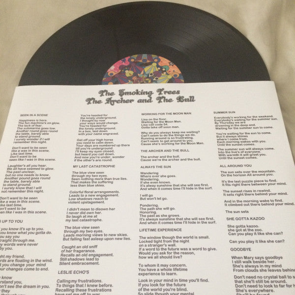 A1. Seen in a Scene 2:41 A2. It's up to you 2:18 A3. High Horse 2:57 A4. My Last Catastrophe 2:46 A5. Leslie Echo's 2:20 A6. Working for the Moon Man 3:21 A7. The Archer and The Bull 2:15 B1. Always the Sun 1:43 B2. Lifetime Experience 3:13 B3. Cleansing 1:30 B4. Summer Sun 2:21 B5. All around you (The sun sets) 1:40 B6. She gotta kazoo 1:47 B7. Goodbye 6:24