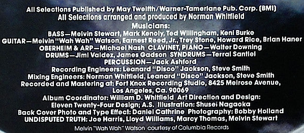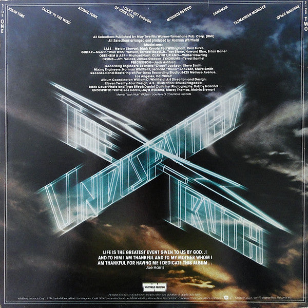 Life is the greatest event given to us by God..! And to Him I am thankful and to my mother whom I am thankful for having me I dedicate this album... Joe Harris Undisputed Truth are [a156378, [a223751, [a789619, [a388587 ℗ © 1979 Warner Bros. Records Inc. Made in U.S.A. [back sleeve, labels Melvin "Wah Wah" Watson courtesy of Columbia Records All Selections Published by May Twelfth/Warner-Tamerlane Pub. Corp. (BMI)