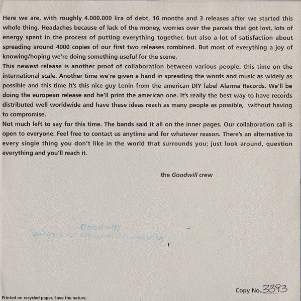 "...The initial idea was to release this 7" EP both on Goodwill Records [... and a label in Brazil [... Apparently the pressing plants of vinyl have closed in Brazil, so our friends from White Frogs contacted Alarma Records, an American label who kindly offered to print this record in the States..."
