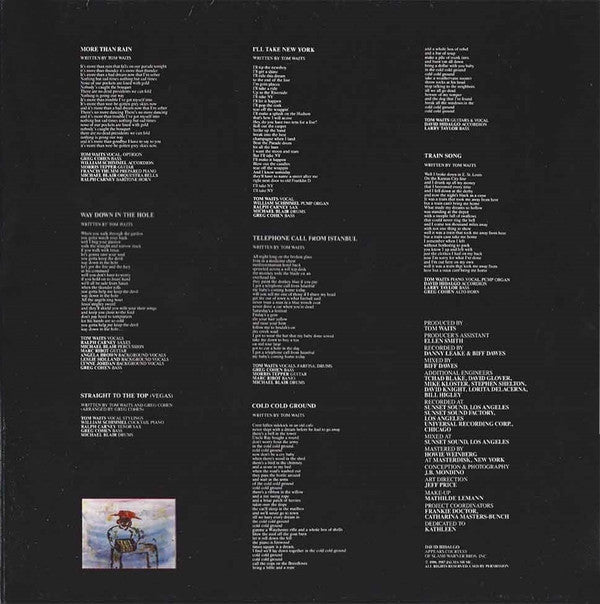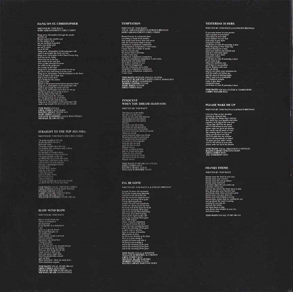 A1. Hang On St. Christopher 2:41 A2. Straight To The Top (Rhumba) 2:27 A3. Blow Wind Blow 3:32 A4. Temptation 3:44 A5. Innocent When You Dream (Barroom) 4:14 A6. I'll Be Gone 3:10 A7. Yesterday Is Here 2:21 A8. Please Wake Me Up 3:28 A9. Franks Theme 1:45 . Act II B1. More Than Rain 3:39 B2. Way Down In The Hole 3:26 B3. Straight To The Top (Vegas) 3:24 B4. I'll Take New York 4:08 B5. Telephone Call From Istanbul 3:08 B6. Cold Cold Ground 4:04 B7. Train Song 3:16 B8. Innocent When You Dream (78) 3:07