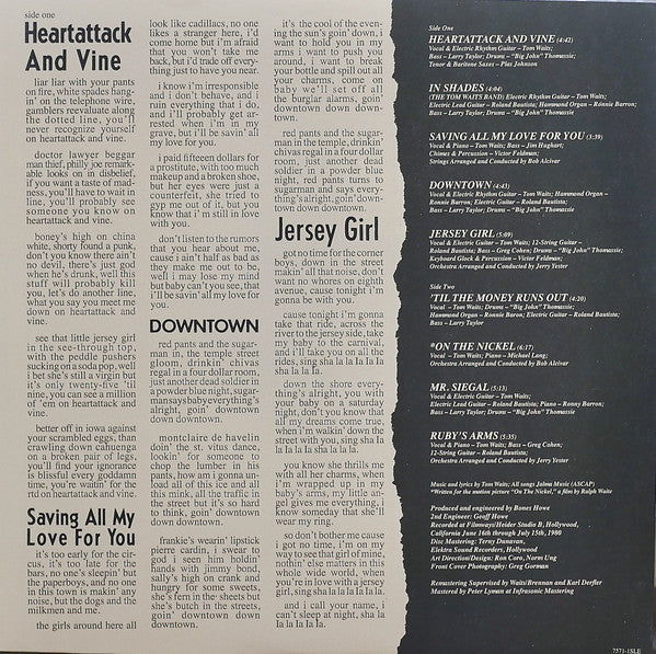 A1. Heartattack And Vine 4:42 A2. In Shades 4:04 A3. Saving All My Love For You 3:39 A4. Downtown 4:43 A5. Jersey Girl 5:09 B1. 'Til The Money Runs Out 4:20 B2. On The Nickel 6:17 B3. Mr. Siegal 5:13 B4. Ruby's Arms 5:35