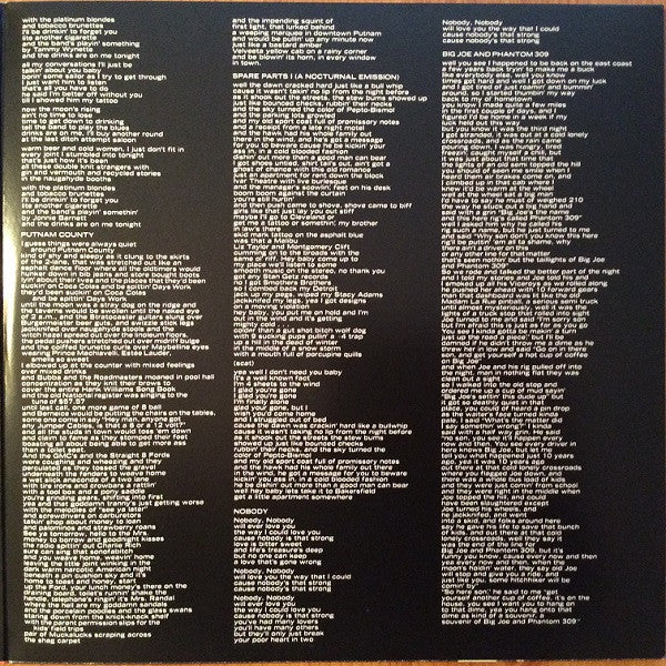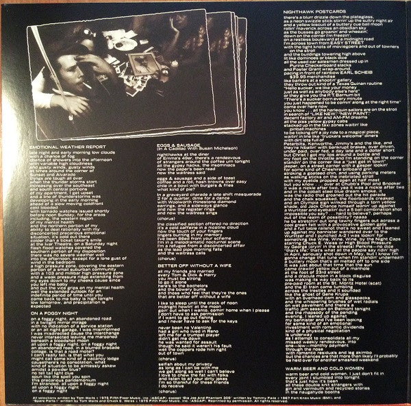 A1. (Opening Intro) 2:59 A2. Emotional Weather Report 3:43 A3. (Intro) 2:18 A4. On A Foggy Night 3:49 A5. (Intro) 1:55 A6. Eggs And Sausage (In A Cadillac With Susan Michelson) 4:13 B1. (Intro) 3:22 B2. Better Off Without A Wife 3:53 B3. Nighthawk Postcards (From Easy Street) 11:27 C1. (Intro) 0:55 C2. Warm Beer And Cold Women 5:21 C3. (Intro) 0:48 C4. Putnam County 7:34 C5. Spare Parts I (A Nocturnal Emission) 6:23 D1. Nobody 2:49 D2. (Intro) 0:41 D3. Big Joe And Phantom 309 6:30 D4. Spare Parts II And Closing 5:14
