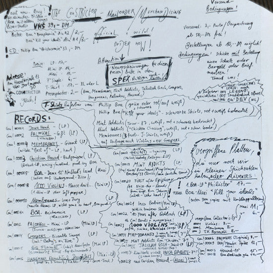 Gatefold Sleeve © + ℗ 1987 CONSTRICTOR UK-Distribution: Red Rhino/Cartel Track A4 is written "Dilyn Y Cach" on the cover and "Dilyn A Cach" on the label.