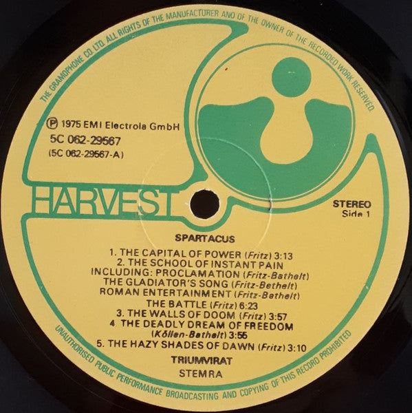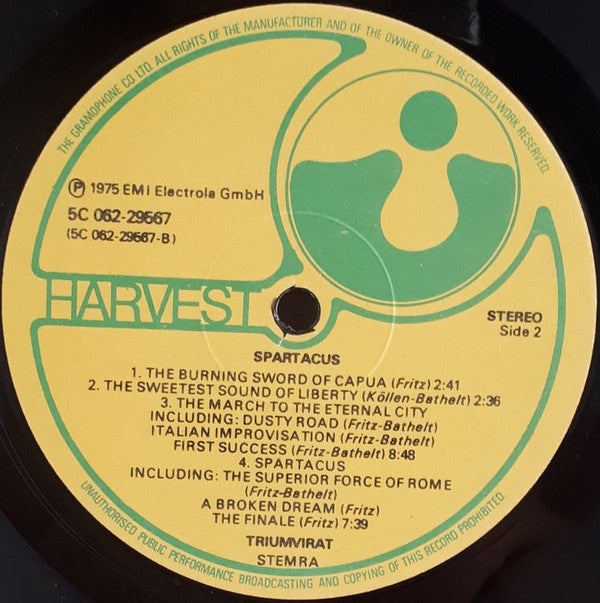 5C 062-29 567 on labels. 1C 062-29 567 on sleeve. Embossed 'Triumvirat' is on the cover, front & back. The runouts are stamped.