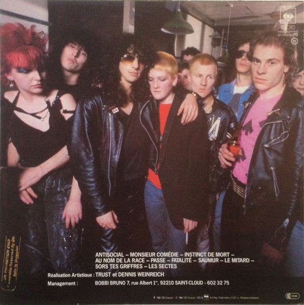 This is the "sunburst" version. For the repressed version with red labels, see [r=11509076 Comes with printed inner sleeve with lyrics and credits and fold-in colour poster. May come with a sticker advertising "Antisocial/Fatalité" or "Antisocial" (Bulldozer logo). Printed in Holland. Made in Holland. The given date for Bon Scott's death on the inner sleeve is 22.2.80, while it appears as 18.2.80, 19.2.80, 20.2.80 on other versions