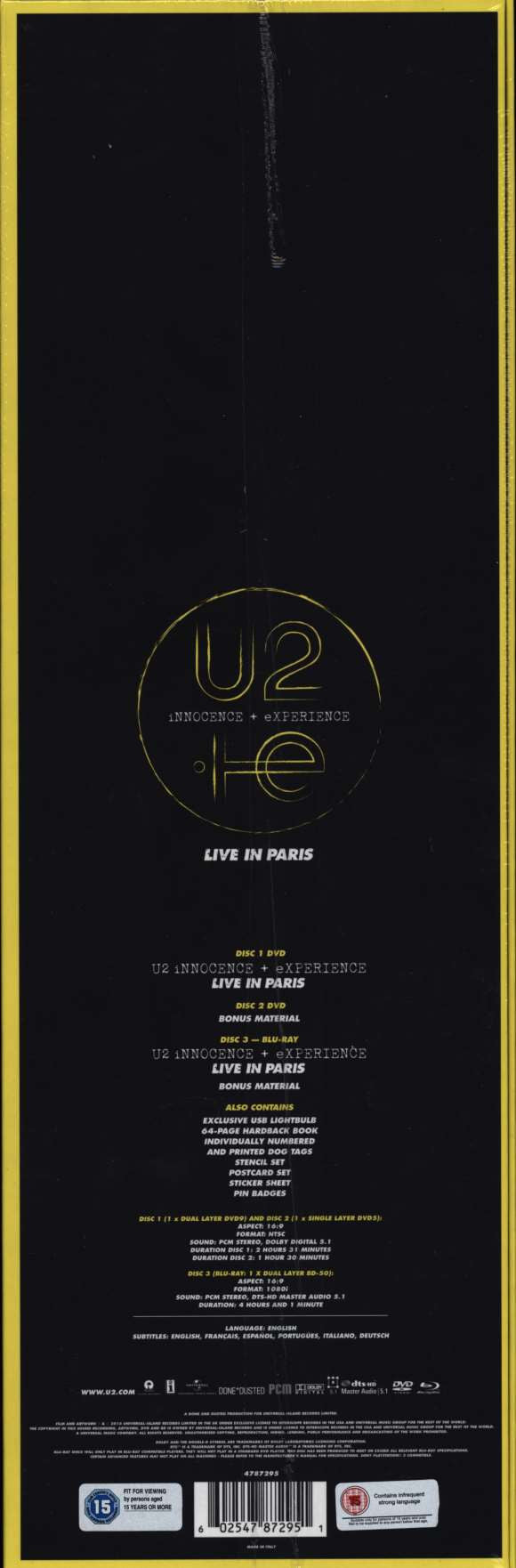 . Concert (Disc 1 And Blu-ray) 1. Patti Smith - People Have The Power 2:212. U2 - The Miracle (Of Joey Ramone) 5:083. U2 - Vertigo 5:054. U2 - I Will Follow 4:255. U2 - Iris (Hold Me Close) 7:346. U2 - Cedarwood Road 4:467. U2 - Song For Someone 4:318. U2 - Sunday Bloody Sunday 5:479. U2 - Raised By Wolves 4:3510. U2 - Until The End Of The World 6:0711. U2 - The Fly 3:3712. U2 - Invisible 4:2213. U2 - Even Better Than The Real Thing 4:2514. U2 - Mysterious Ways 4:3715. U2 - Elevation 5:0716. U2 - Every Breaking Wave 5:3817. U2 - October 2:1418. U2 - Bullet The Blue Sky 7:4019. U2 - Zooropa 2:2420. U2 - Where The Streets Have No Name 5:2721. U2 - Pride (In The Name Of Love) 4:4422. U2 - With Or Without You 7:2423. U2 - Stephen Hawking 'Global Citizen' 1:1524. U2 - City Of Blinding Lights 6:1425. U2 - Beautiful Day 5:1026. U2 - Mother And Child Reunion 1:5327. U2 - Bad 6:1928. U2 - One 5:4429. U2, Eagles Of Death Metal - People Have The Power 7:5330. Eagles Of Death Metal - I Love You All The Time 4:2931. U2 - Credits 3:38. Bonus Material (Disc 2 And Blu-ray) 32. Gavin Friday - Cedarwood Road - A Gavin Friday Narration 4:2633. U2 - Out Of Control (December 6th, 2015 - Paris) 5:1134. U2 - The Future Better Hurry Up 1:1435. U2 - The Electric Co. (November 11th 2015 - Paris) 5:2336. U2 - i + e - Behind The Scenes With The Director 4:4637. U2, Patti Smith - Bad / People Have The Power (With Patti Smith - December 6th 2015 - Paris) 15:1938. U2, Johnny Cash - The Wanderer 4:4439. U2, Lykke Li - The Troubles 4:4640. U2 - Credits 2:02. Music Videos (Disc 2 And Blu-ray) 41a. U2 - Ordinary Love 3:3941b. U2 - Invisible 4:0941c. U2 - The Miracle (Of Joey Ramone) 4:4441d. U2 - Every Breaking Wave - A Film By Aoife McArdle 13:0341e. U2 - Song For Someone (Directed By Vincent Haycock) 8:4541f. U2 - Song For Someone (Behind The Scenes) 4:3041g. U2 - Song For Someone (Directed By Matt Mahurin) 4:00
