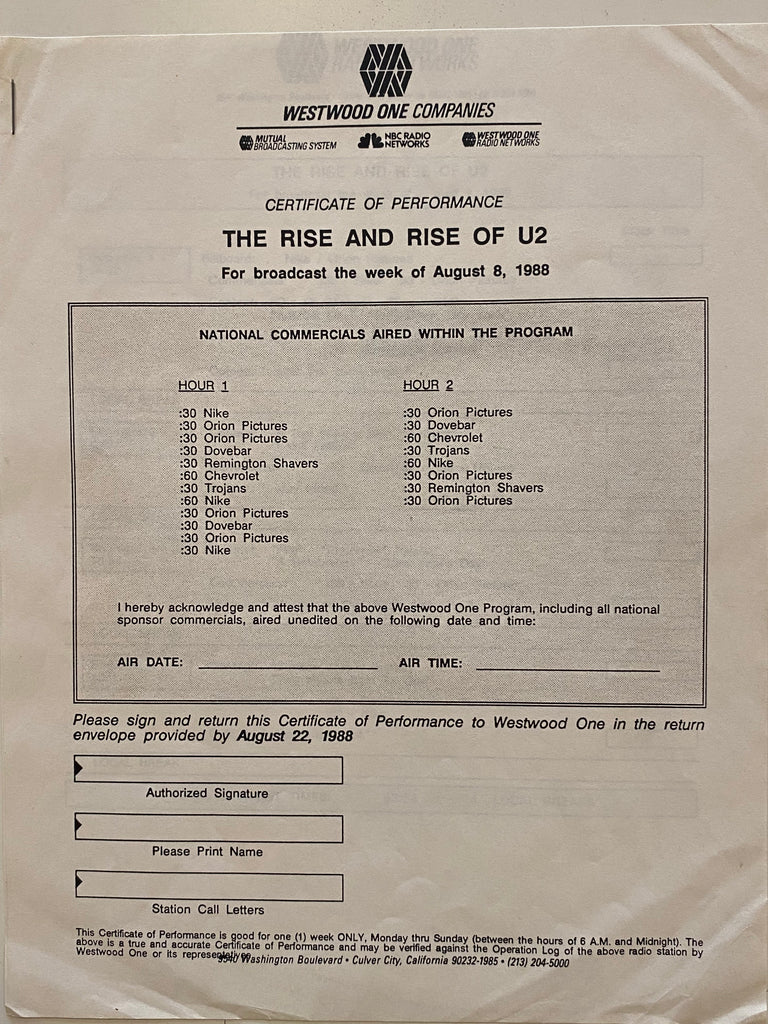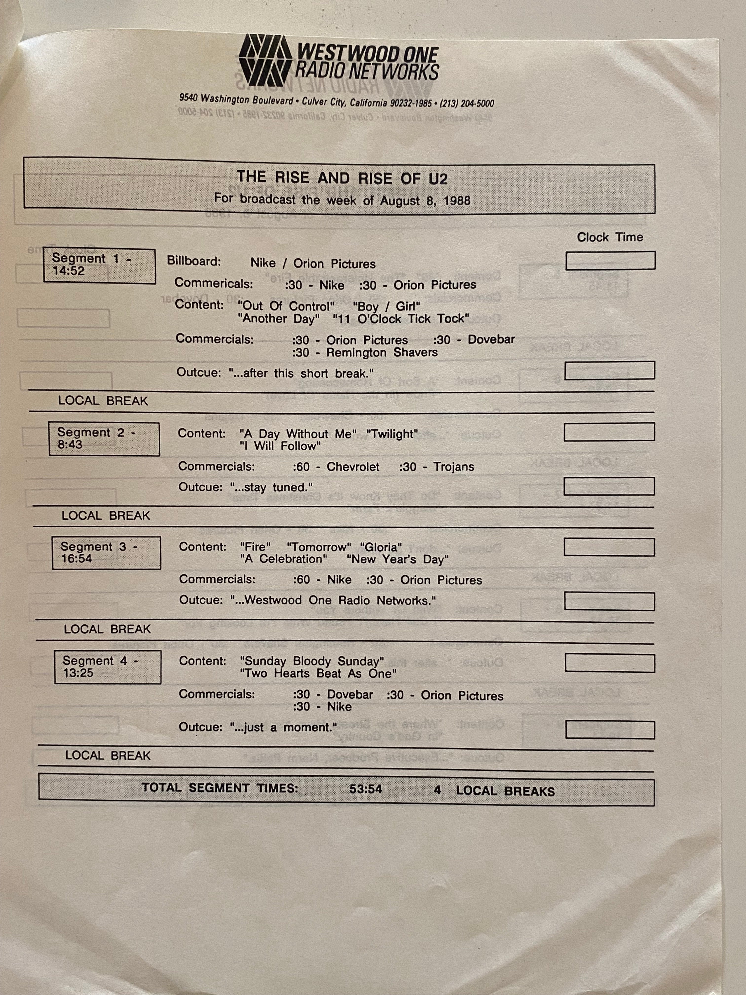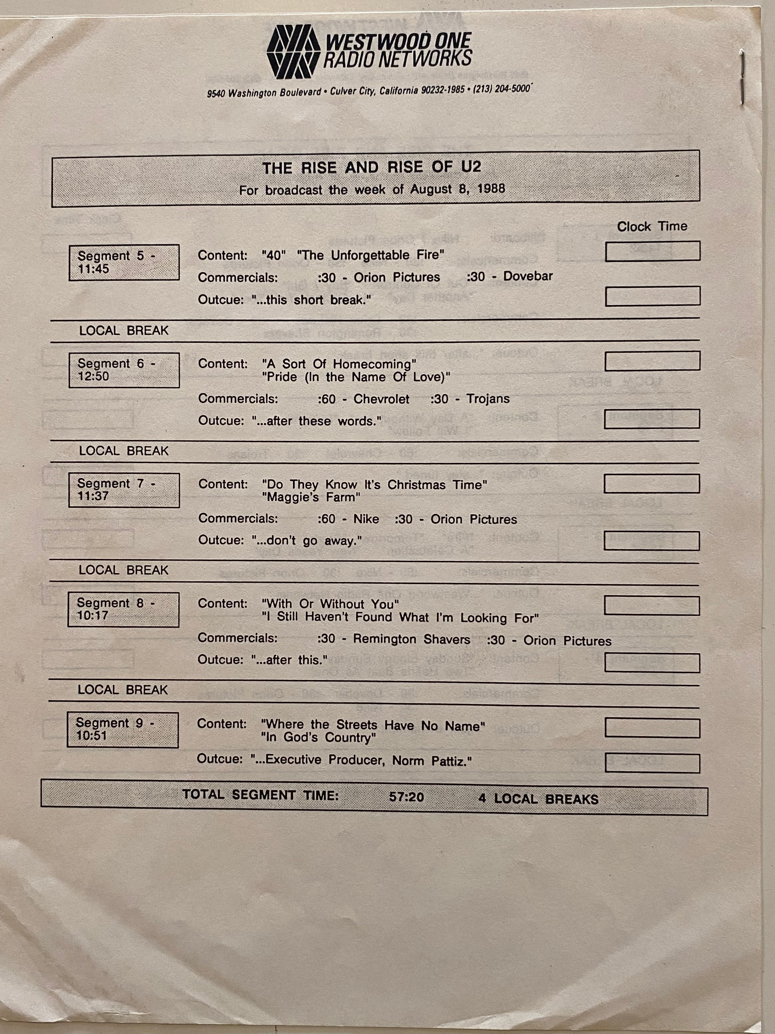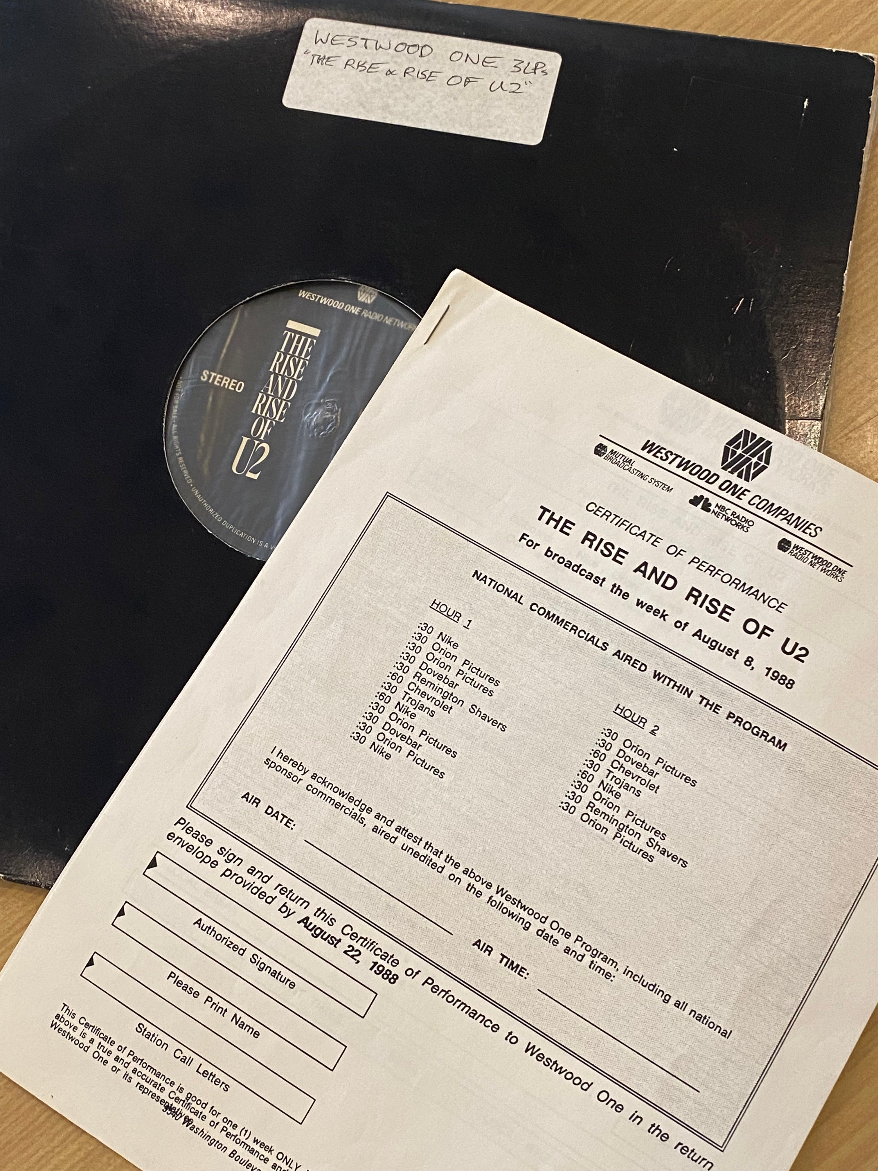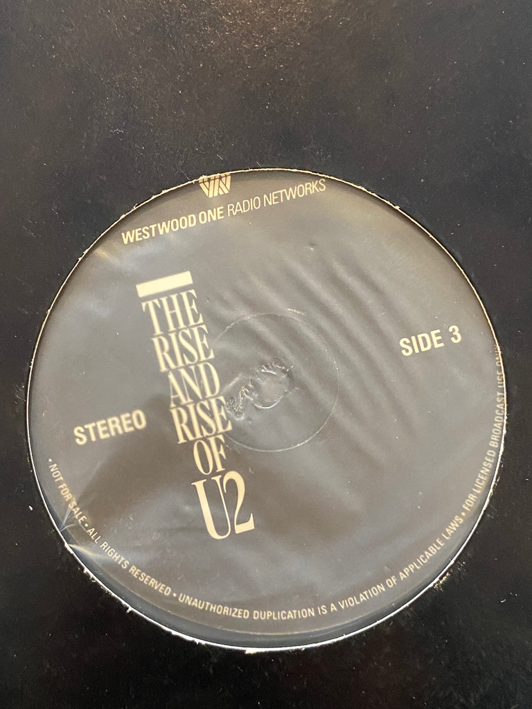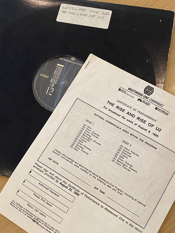 Westwood One 3×LP radioshow “The Rise And Rise Of U2”, broadcast in the week of August 8, 1988. Includes original 2-page cue sheet. Rare in this condition.
