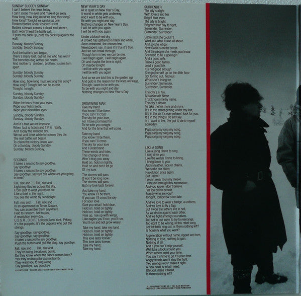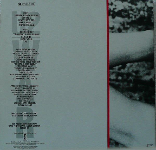 A1. Sunday Bloody Sunday 4:38 A2. Seconds 3:12 A3. New Year's Day 5:38 A4. Like A Song... 4:48 A5. Drowning Man 4:12 B1. The Refugee 3:40 B2. Two Hearts Beats As One 4:05 B3. Red Light 3:46 B4. Surrender 5:35 B5. "40" 2:38