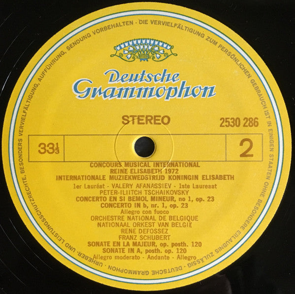 Le présent enregistrement public a été fait directement, et sans corrections, à partir de léexécution que Valery Afanassiev donna le 1er juin 1972 à Bruxelles, dans la grande salle du Palais des Beaux-Arts, à l' occasion des épreuved finales du Concours Musical International Reine Elisabeth 1972, en présence de Sa Majesté la Reine des Belges. Les interprétations ici gravées furent décisives pour sa qualification.