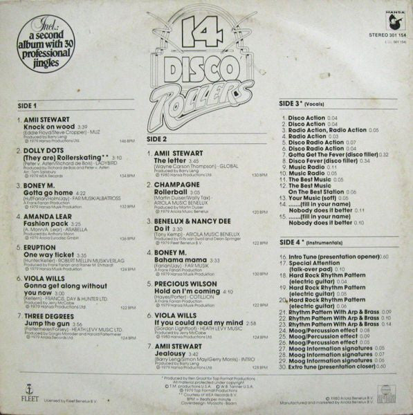A1. Amii Stewart - Knock On Wood 3:39 A2. Dolly Dots - (We Are) Rollerskating 3:10 A3. Boney M. - Gotta Go Home 4:22 A4. Amanda Lear - Fashion Pack 3:25 A5. Eruption (4) - One Way Ticket 3:35 A6. Viola Wills - Gonna Get Along Without You Now 3:00 A7. The Three Degrees - Jump The Gun 3:56 B1. Amii Stewart - The Letter 3:45 B2. Champagne (5) - Rollerball 3:05 B3. Benelux & Nancy Dee - Do It 3:30 B4. Boney M. - Bahama Mama 3:33 B5. Precious Wilson - Hold On I'm Coming 4:10 B6. Viola Wills - If You Could Read My Mind 2:58 B7. Amii Stewart - Jealousy 3:42 . Vocals C1. Ren Groot - Disco Action! 0:04 C2. Ren Groot - Disco Action! 0:04 C3. Ren Groot - Radio Action, Radio Action! 0:05 C4. Ren Groot - Radio Action! 0:03 C5. Ren Groot - Disco Radio Action! 0:07 C6. Ren Groot - Disco Radio Action! 0:04 C7. Ren Groot - Gotta Get The Fever (Disco Filler) 0:32 C8. Ren Groot - Disco Fever (Disco Filler) 0:34 C9. Ren Groot - Music Radio 0:11 C10. Ren Groot - Music Radio 0:05 C11. Ren Groot - The Best Music! 0:05 C12. Ren Groot - The Best Music On The Best Station 0:06 C13. Ren Groot - Your Music (Soft) 0:05 C14. Ren Groot - ......(Fill In Your Name) Nobody Does It Better 0:11 C15. Ren Groot - ......(Fill In Your Name) Nobody Does It Better 0:10 . Instrumentals D1. Ren Groot - Intro Tune (Presentation Opener) 1:00 D2. Ren Groot - Special Attention (Talk-Over Pad) 0:10 D3. Ren Groot - Hard Rock Rhythm Pattern (Electric Guitar) 0:04 D4. Ren Groot - Hard Rock Rhythm Pattern (Electric Guitar) 0:05 D5. Ren Groot - Hard Rock Rhythm Pattern (Electric Guitar) 0:06 D6. Ren Groot - Rhythm Pattern With Arp & Brass 0:09 D7. Ren Groot - Rhythm Pattern With Arp & Brass 0:10 D8. Ren Groot - Rhythm Pattern With Arp & Brass 0:14 D9. Ren Groot - Moog / Percussion Effect 0:08 D10. Ren Groot - Moog / Percussion Effect 0:09 D11. Ren Groot - Moog / Percussion Effect 0:05 D12. Ren Groot - Moog Information Signatures 0:05 D13. Ren Groot - Moog Information Signatures 0:07 D14. Ren Groot - Moog Information Signatures 0:06 D15. Ren Groot - Extro Tune (Presentation Closer) 1:00