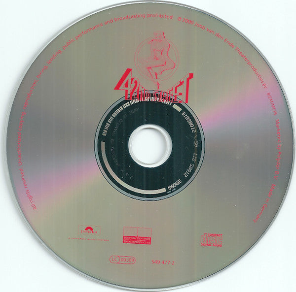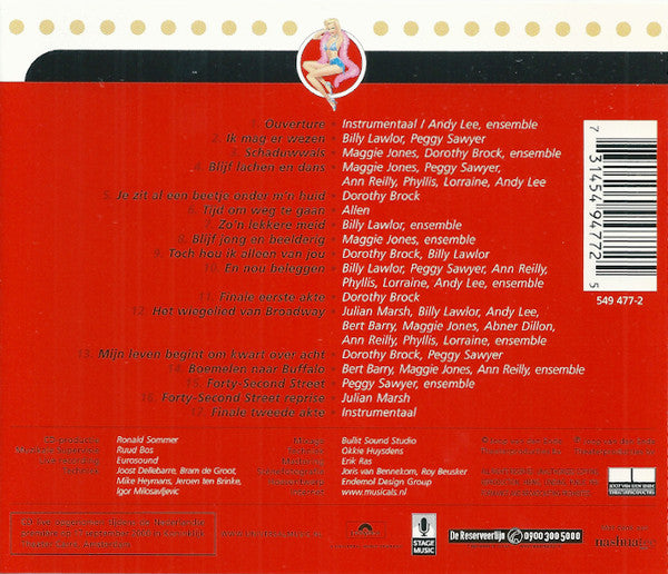 1. Andy Lee (15), "42nd Street" Original Dutch Cast, Ensemble - Ouverture (Instrumentaal) 5:262. Billy Lawlor, Peggy Sawyer - Ik Mag Er Wezen 2:373. Maggie Jones (2), Dorothy Brock, "42nd Street" Original Dutch Cast, Ensemble - Schaduwwals 5:404. Maggie Jones (2), Peggy Sawyer, Ann Reilly, Phyllis Dale, Lorraine Fleming, Andy Lee (15) - Blijf Lachen En Dans 4:365. Dorothy Brock - Je Zit Al Een Beetje Onder Mijn Huid 2:566. "42nd Street" Original Dutch Cast, Ensemble - Tijd Om Weg Te Gaan 3:047. Billy Lawlor, "42nd Street" Original Dutch Cast, Ensemble - Zo'n Lekkere Meid 2:038. Maggie Jones (2), "42nd Street" Original Dutch Cast, Ensemble - Blijf Jong En Beelderig 5:419. Dorothy Brock, Billy Lawlor - Toch Hou Ik Alleen Van Jou 2:5310. Billy Lawlor, Peggy Sawyer, Ann Reilly, Phyllis Dale, Lorraine Fleming, Andy Lee (15), "42nd Street" Original Dutch Cast, Ensemble - En Nou Beleggen 4:0111. Dorothy Brock - Finale Eerste Akte 1:23
