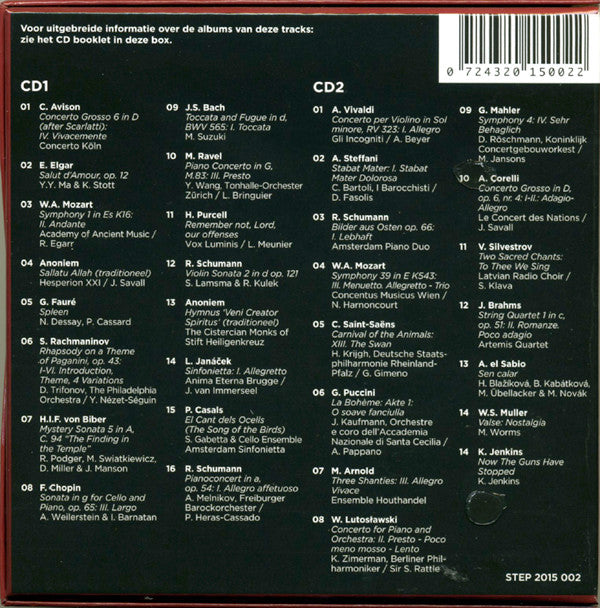 1-1. Concerto Köln - Concerto Grosso 6 In D (After Scarlatti): IV. Vivacemente 3:191-2. Yo-Yo Ma, Kathryn Stott - Salut D'Amour, Op. 12 2:471-3. The Academy Of Ancient Music, Richard Egarr - Symphony 1 In Es K16: II. Andante 3:281-4. Hespèrion XXI, Jordi Savall - Sallatu Allah (Traditioneel) 4:151-5. Natalie Dessay, Philippe Cassard - Spleen 2:011-6. Daniil Trifonov, The Philadelphia Orchestra, Yannick Nézet-Séguin - Rhapsody On A Theme Of Paganini, Op. 43: I-VI. Introduction, Theme, 4 Variations 2:351-7. Rachel Podger, Marcin Świątkiewicz, David Miller (7), Jonathan Manson - Mystery Sonata 5 In A, C. 94 "The Finding In The Temple" 7:221-8. Alisa Weilerstein, Inon Barnatan - Sonata In G For Cello And Piano, Op. 65: III> Largo 3:371-9. Masaaki Suzuki - Toccata And Fugue In D, BWV 565: I. Toccata 2:341-10. Yuja Wang, Tonhalle-Orchester Zürich, Lionel Bringuier - Piano Concerto In G, M.83: III. Presto 3:591-11. Vox Luminis, Lionel Meunier - Remember Not, Lord, Our Offenses 3:001-12. Simone Lamsma, Robert Kulek - Violin Sonata 2 In D Op. 121 13:041-13. The Cistercian Monks Of Stift Heiligenkreuz - Hymnus "Veni Creator Spiritus" (Traditioneel) 2:351-14. Anima Eterna, Jos van Immerseel - Sinfonietta: I. Allegretto 2:341-15. Sol Gabetta, Amsterdam Sinfonietta - El Cant Dels Ocells (The Song Of The Birds) 3:401-16. Alexander Melnikov, Freiburger Barockorchester, Pablo Heras-Casado - Pianoconcert In A, Op. 54: I. Allegro Affetuoso 14:402-1. Gli Incogniti, Amandine Beyer - Concerto Per Violino In Sol Minore, RV 323: I. Allegro 2:312-2. Cecilia Bartoli, I Barocchisti, Diego Fasolis - Stabat Mater: I. Stabat Mater Dolorosa 2:142-3. Amsterdam Piano Duo - Bilder Aus Osten Op. 66: I. Lebhaft 3:342-4. Concentus Musicus Wien, Nikolaus Harnoncourt - Symphony 39 In E K543: III. Menuetto, Allegretto 3:572-5. Harriet Krijgh, Staatsphilharmonie Rheinland-Pfalz, Gustavo Gimeno - Carnival Of The Animals: XIII. The Swan 3:112-6. Jonas Kaufmann, Orchestra Dell'Accademia Nazionale Di Santa Cecilia, Antonio Pappano - La Boheme: Akte 1: O Soave Fanciulla 4:172-7. Ensemble Houthandel Antwerpen - Three Shanties: III. Allegro Vivace 2:512-8. Krystian Zimerman, Berliner Philharmoniker, Sir Simon Rattle - Concerto For Piano And Orchestra: II. Presto - Poco Meno Mosso - Lento 4:472-9. Dorothea Röschmann, Concertgebouworkest, Mariss Jansons - Symphony 4: IV. Sehr Behaglich 9:342-10. Le Concert Des nations, Jordi Savall - Concerto Grosso In D, Op. 6. nr. 4: I-II. Adagio - Allegro 3:322-11. Latvian Radio Choir, Sigvards Kļava - Two Sacred Chants: To Thee We Sing 3:152-12. Artemis Quartett - String Quartet 1 In C, Op. 51: II. Romanze, Poco Adagio 6:502-13. Hana Blažíková, Barbora Kabátková, Margit Übellacker, Martin Novák - Sen Calar 4:542-14. Marcel Worms - Valse: Nostalgia 1:512.15. Karl Jenkins - Now The Guns Have Stopped 3:243-1. Charles Antoine Beckand - Dans L'Attente 4:153-2. Adolphe Joseph Beckand - Une Rose... De Vous 6:223-3. Charles Antoine Beckand - Salutations Cordiales 4:013-4. Charles Antoine Beckand - Valse Brillante 3:593-5. Charles Antoine Beckand - Heureux Presage 5:003-6. Adolphe Joseph Beckand - Quand Je T'Enlace 4:563-7. Charles Antoine Beckand - Souvenir De Blankenbergche 6:033-8. Charles Antoine Beckand - Sur Le Boulevard 5:113-9. Charles Antoine Beckand - Vous Et Moi 3:563-10. Charles Antoine Beckand - Reverie 4:463-11. Charles Antoine Beckand - En Famille 3:303-12. Charles Antoine Beckand - En 1807 4:483-13. Charles Antoine Beckand - Patrie 3:303-14. Charles Antoine Beckand - Priere A Sainte-Therese 5:03
