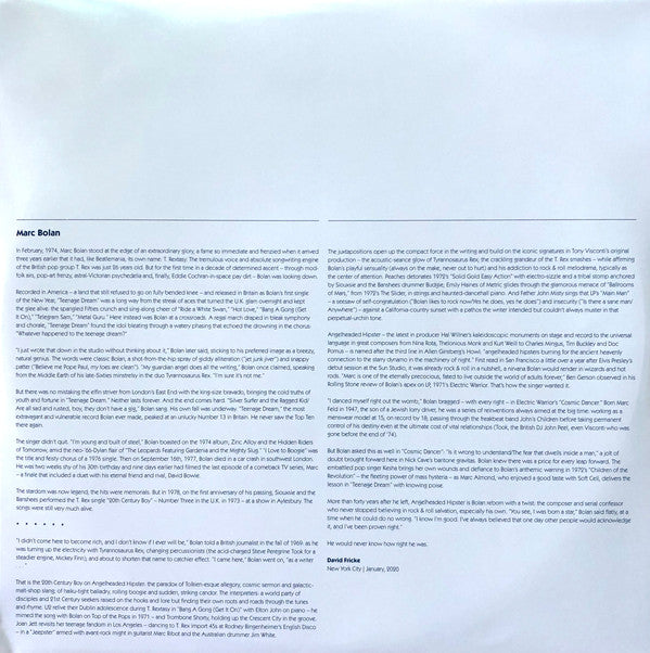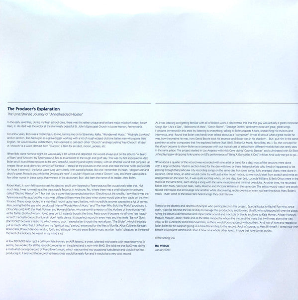 A1. Kesha - Children Of The Revolution A2. Nick Cave - Cosmic Dancer A3. Joan Jett - Jeepster A4. Devendra Banhart - Scenescof A5. Lucinda Williams - Life's A Gas A6. Peaches - Solid Gold, Easy Action A7. BØRNS - Dawn Storm B1. Beth Orton - Hippy Gumbo B2. King Khan - I Love to Boogie B3. Gaby Moreno - Beltane Walk B4. U2, Elton John - Bang A Gong (Get It On) B5. John Cameron Mitchell - Diamond Meadows B6. Emily Haines - Ballrooms Of Mars C1. Father John Misty - Main Man C2. Perry Farrell - Rock On C3. Elysian Fields - The Street And Babe Shadow C4. Gavin Friday - The Leopards C5. Nena Kerner - Metal Guru C6. Marc Almond - Teenage Dream D1. Helga Davis - Organ Blues D2. Todd Rundgren - Planet Queen D3. Jesse Harris - Great Horse D4. Sean Lennon, Charlotte Kemp Muhl - Mambo Sun D5. Victoria Williams, Julian Lennon - Pilgrim's Tale D6. David Johansen - Bang a Gong (Get It On) [Reprise] D7. Maria McKee, Gavin Friday - She Was Born To Be My Unicorn / Ride A White Swan